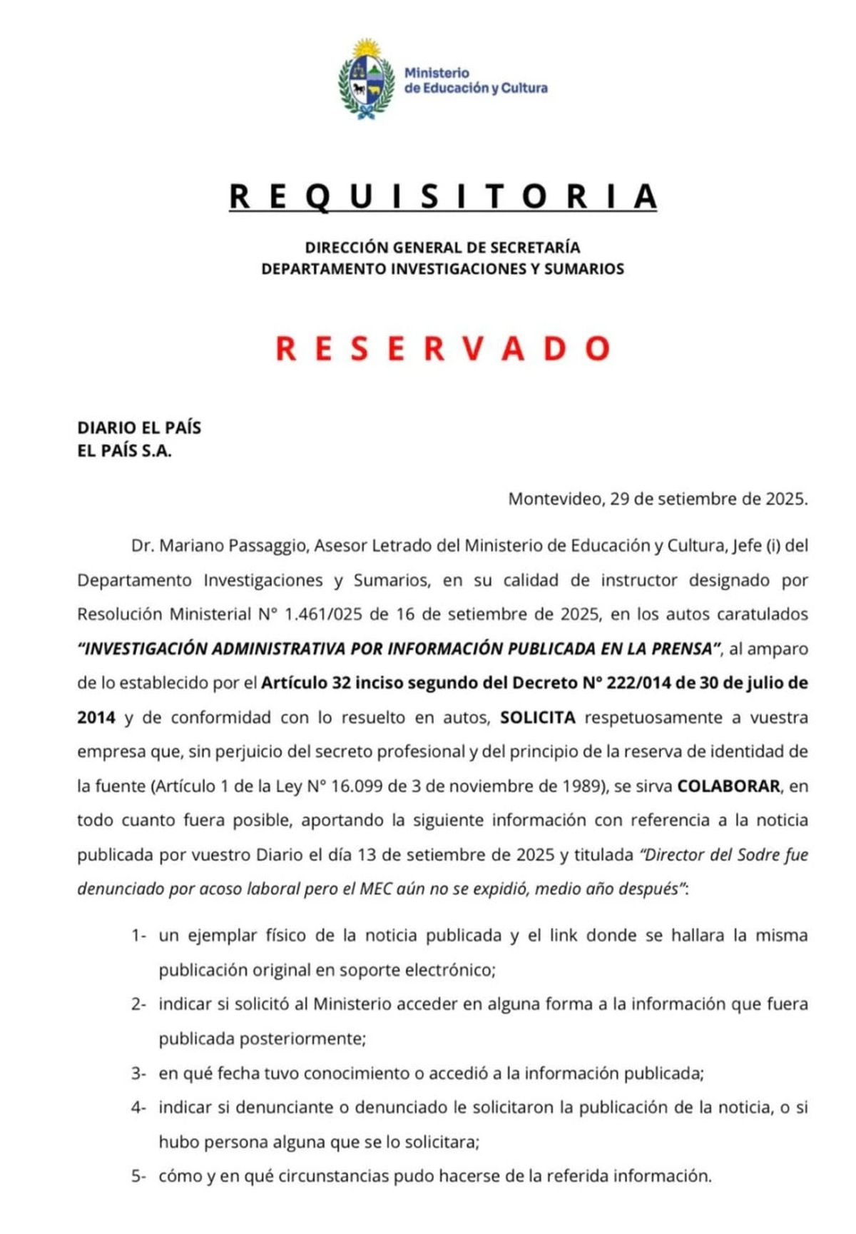 El País publicó este viernes de mañana la requisitoria que recibió del MEC para que el diario dijera por ejemplo si “el denunciante o el denunciado solicitaron la publicación de la noticia”, y “cómo y en qué circunstancias pudo (el medio) hacerse de la referida información”.