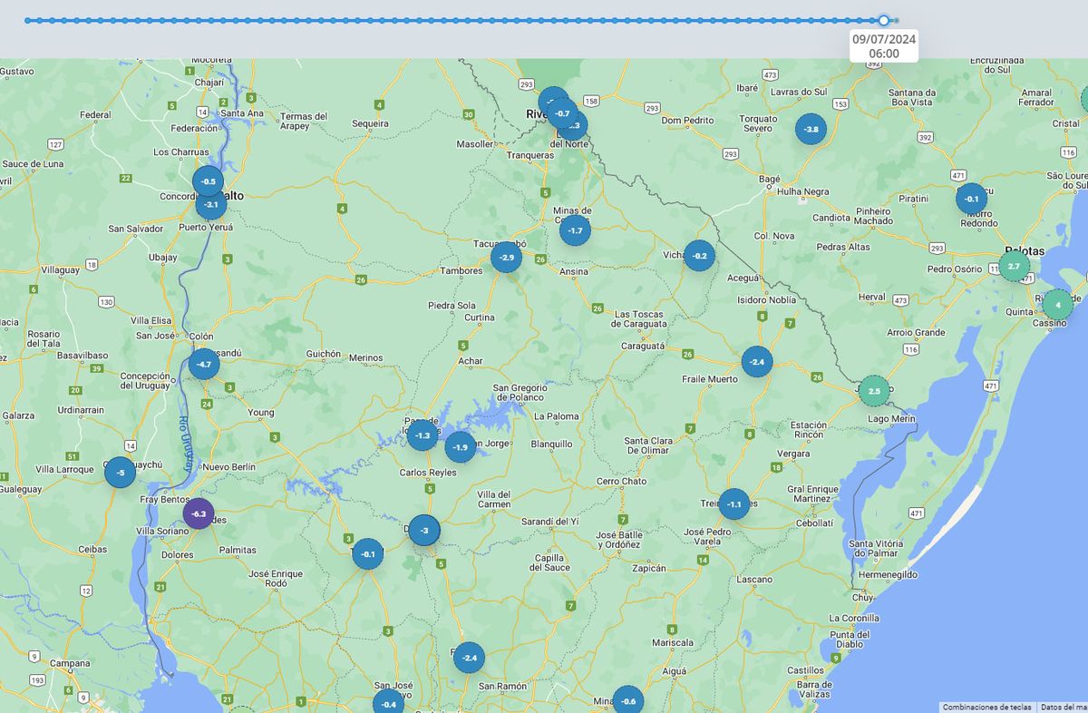 Este martes, por ejemplo, a las 6 AM, el Instituto Uruguayo de Meteorología (Inumet) registró una temperatura mínima de -6,3º en la estación meteorológica de Mercedes, en Soriano, que subió a -6º una hora después.