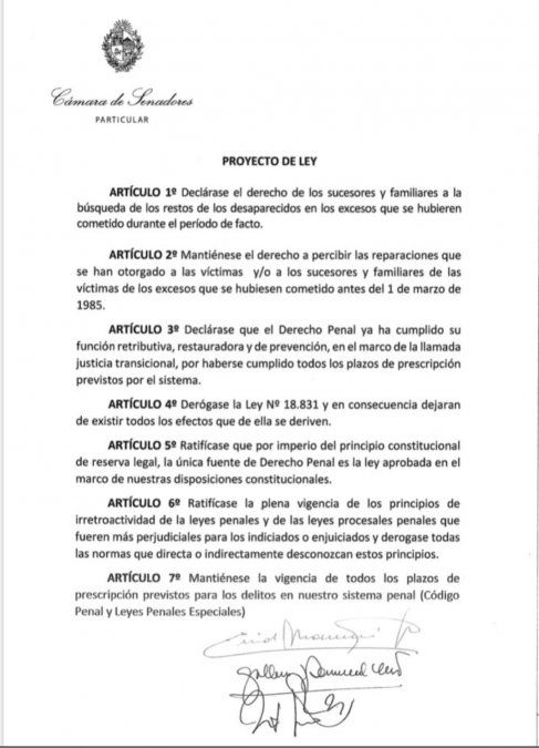 Los artículos 3 y 4 restablecen la prescripción de los delitos cometidos durante la dictadura, derogando la ley 18.831 que en el 2011 declaró a esos delitos como de lesa humanidad y, por lo tanto, imprescriptibles.