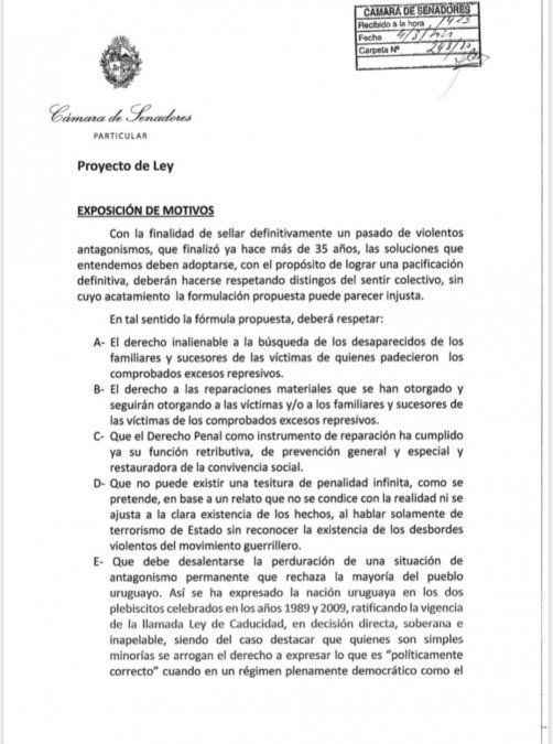 El senador Guido Manini Ríos presentó al Parlamento su anunciado proyecto de ley para reinstalar la Caducidad de la Pretensión Punitiva del Estado sobre los crímenes cometidos durante la última dictadura (1973-1985) por parte de militares ahora retirados.