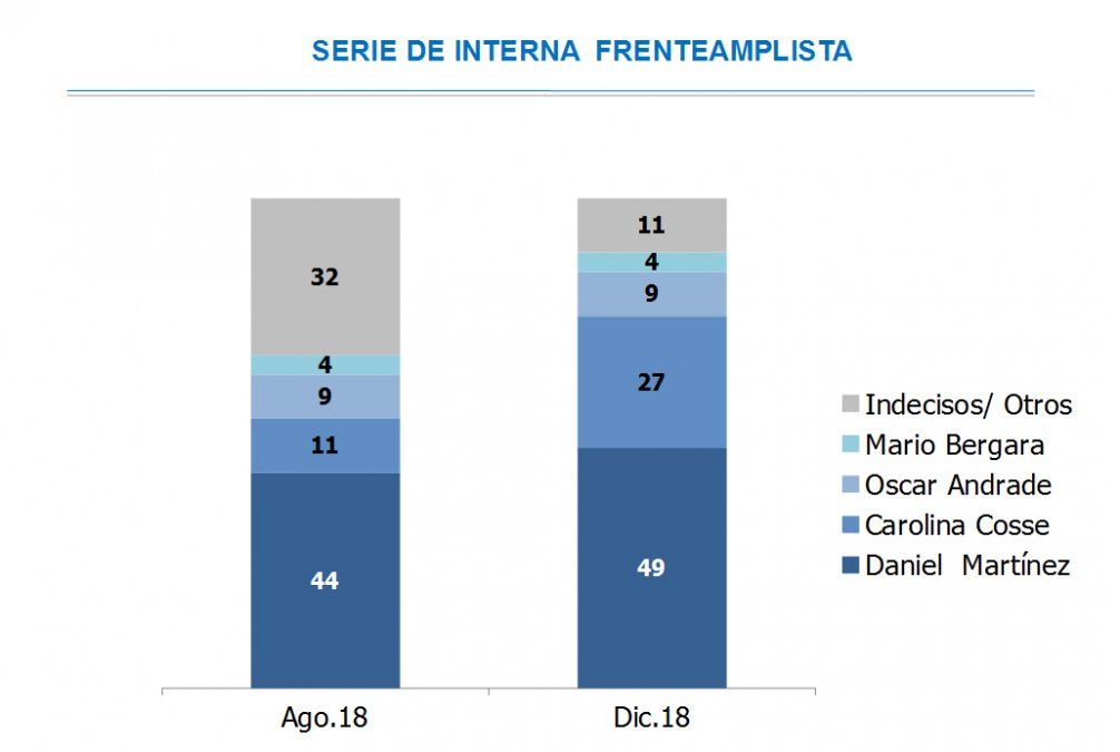 En el Frente Amplio lleva ventaja Daniel Martínez con 49%, seguido de Carolina Cosse con 27%, Óscar Andrade tiene 9% y Mario Bergara 4%. Los indecisos en diciembre representan el 11%.