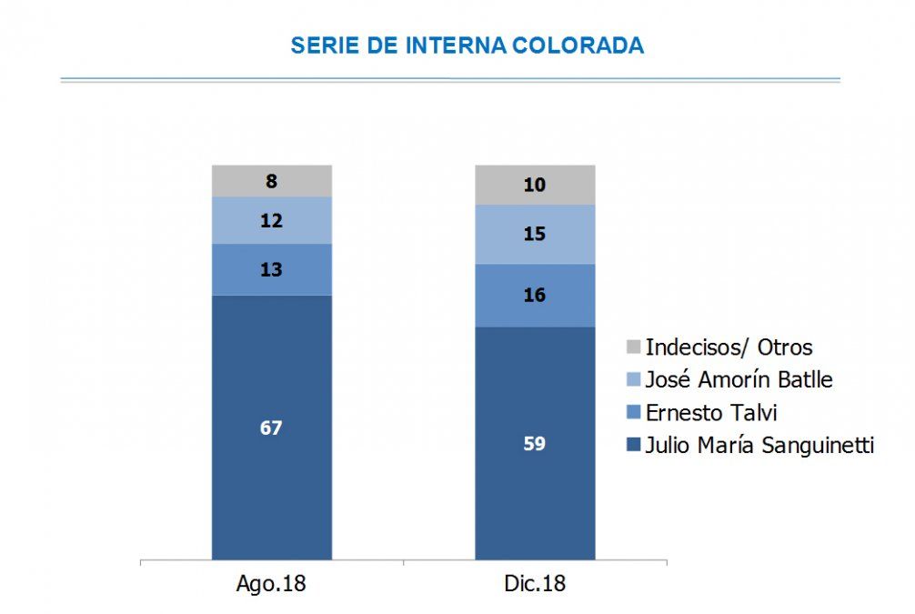 Julio María Sanguinetti tiene 59%, seguido por Ernesto Talvi con 16% y José Amorín Batlle con 15%. Los que responden que no sienten simpatía política por ninguno de los tres representan el 7%, mientras que los indecisos son el 3%.