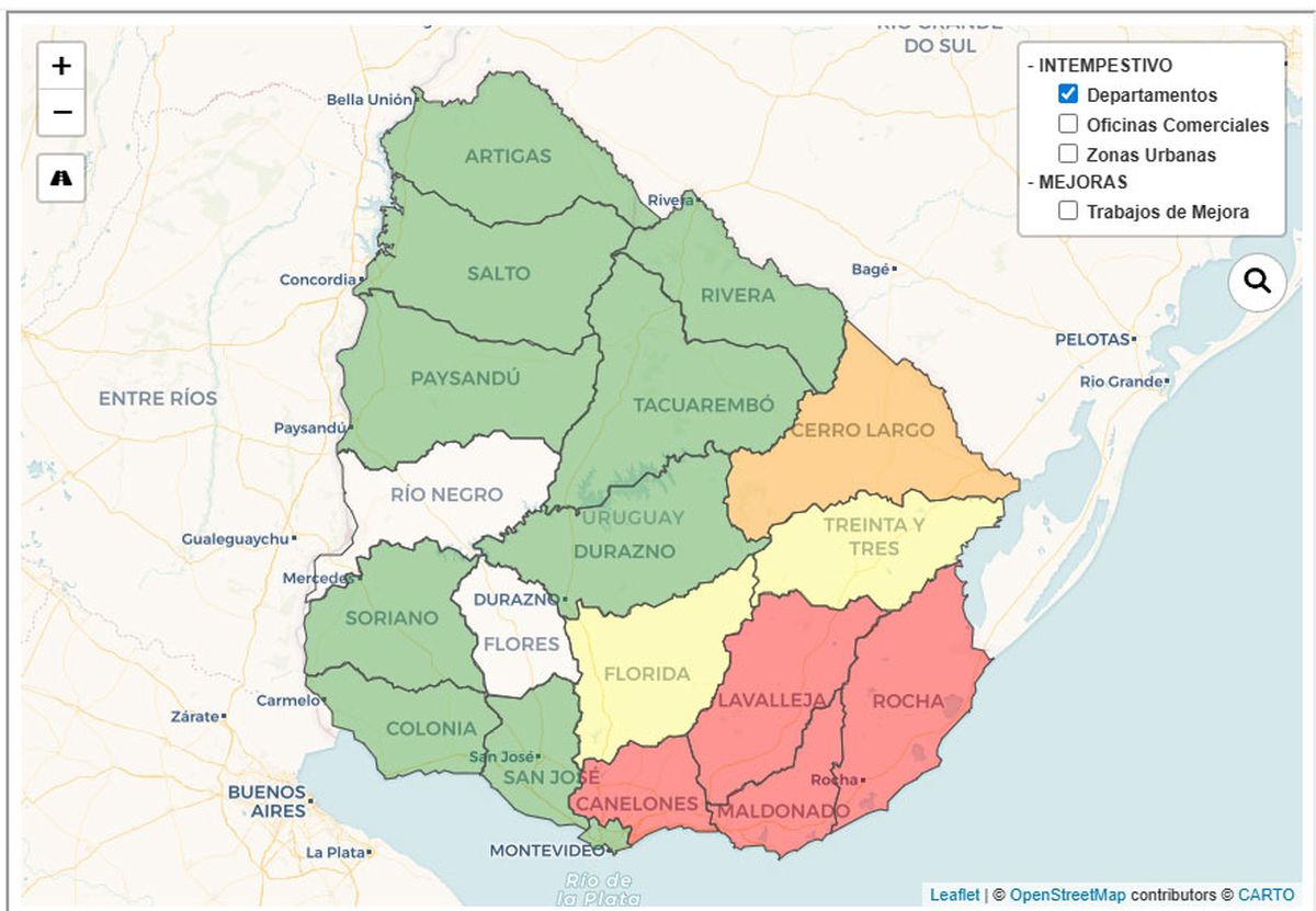 Según el mapa interactivo en tiempo real que publica UTE en su sitio web, Canelones tiene más de 41.000 clientes sin luz.