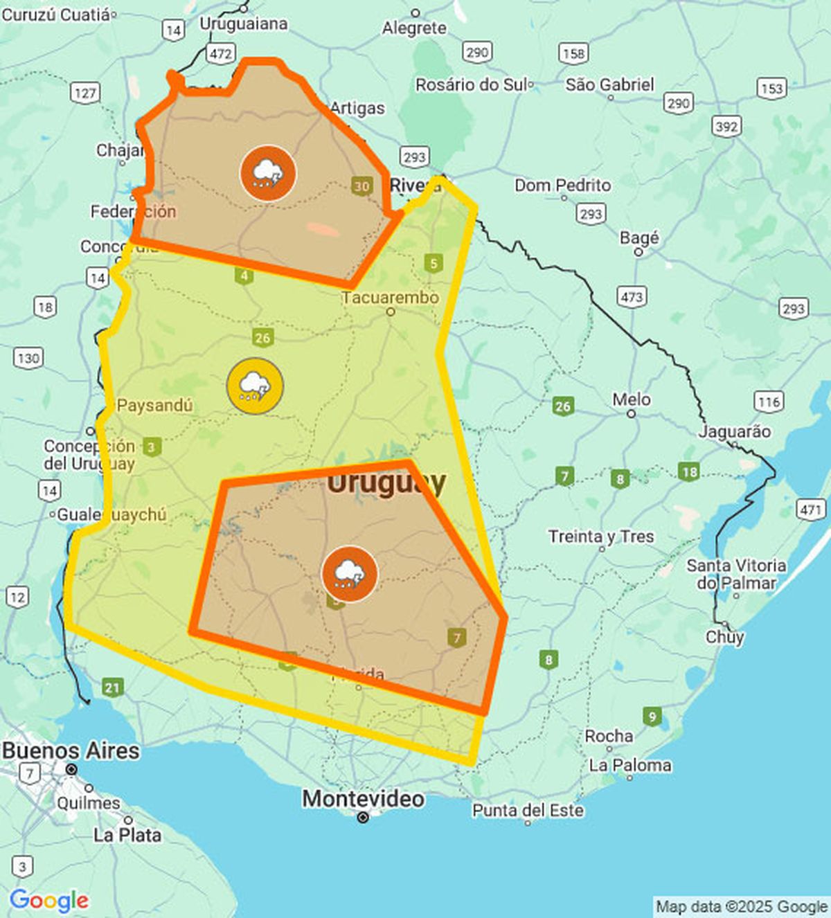 La alerta naranja se divide en dos zonas, una al norte y otra en el centro y sur del país, mientras que la alerta amarilla rige para casi toda la mitad oeste de Uruguay, (ver mapa).
