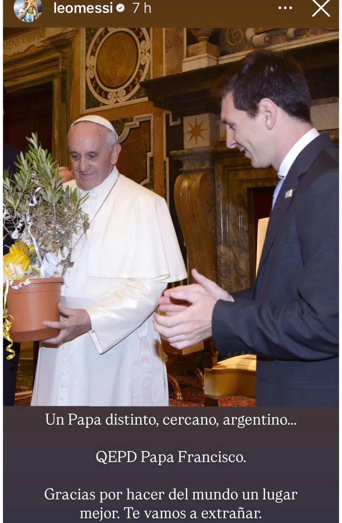 "Un Papa distinto, cercano, argentino... QEPD papa Francisco", escribió la actual estrella del Inter Miami de la liga norteamericana (MLS) en Instagram.