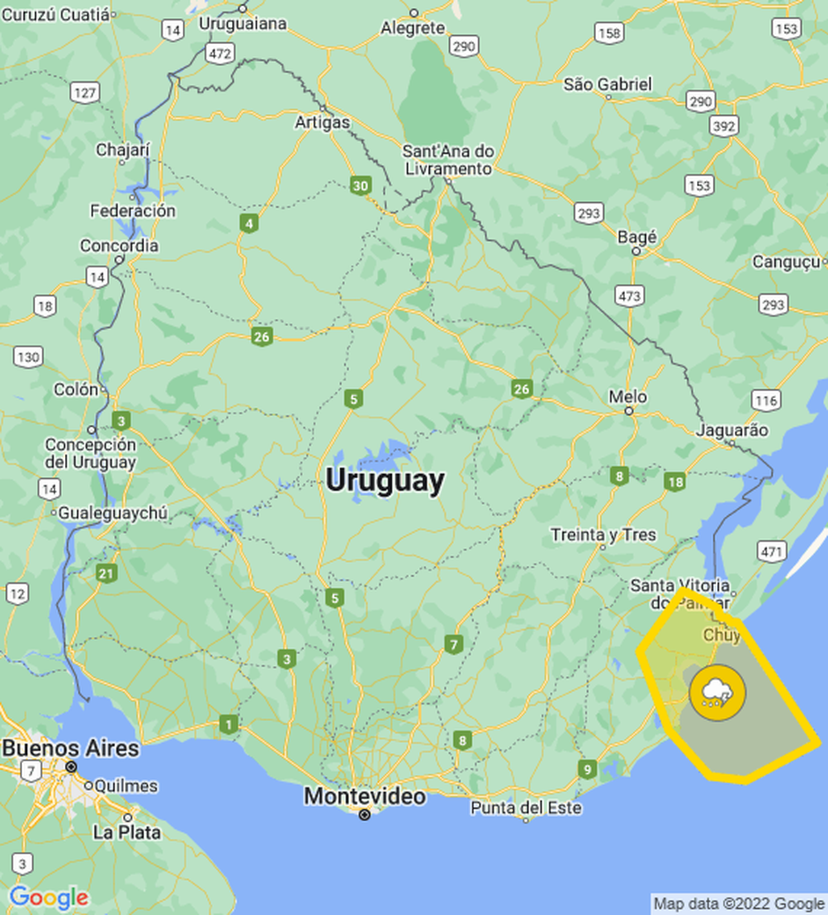 Meteorología actualizó alerta color amarilla por tormentas fuertes para el departamento de Rocha. Además, podrá darse lluvia intensa en cortos períodos de tiempo, caída de granizo, actividad eléctrica intensa y rachas de viento fuertes.