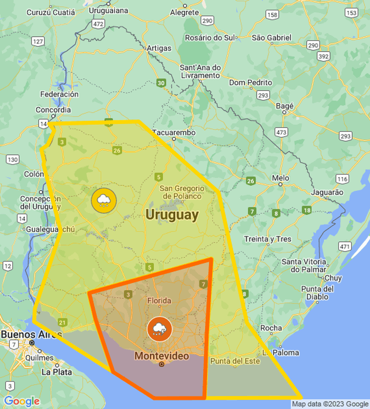 El Instituto Uruguayo de Meteorología actualizó la alerta amarilla, extendiéndola a más localidades, y emitió una alerta color naranja por tormentas fuertes y lluvias intensas.