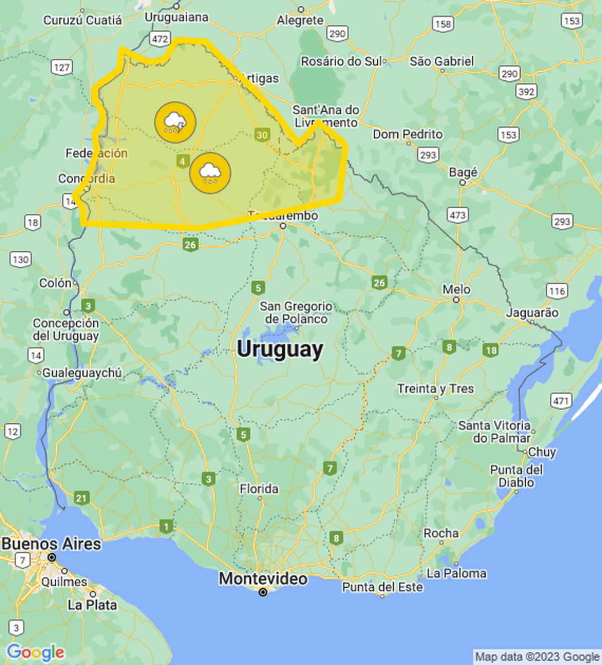 El Instituto Uruguayo de Meteorología actualizó la alerta amarilla por lluvias intensas que rige para cinco departamentos, hasta las 18:30.