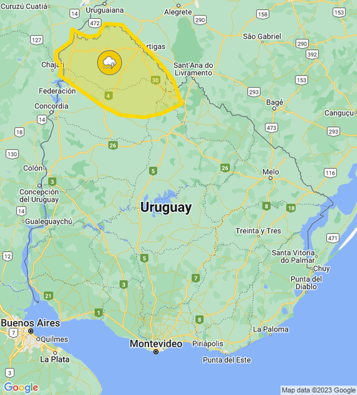 Meteorología actualizó alerta amarilla por tormentas fuertes para Artigas, Rivera y Salto.