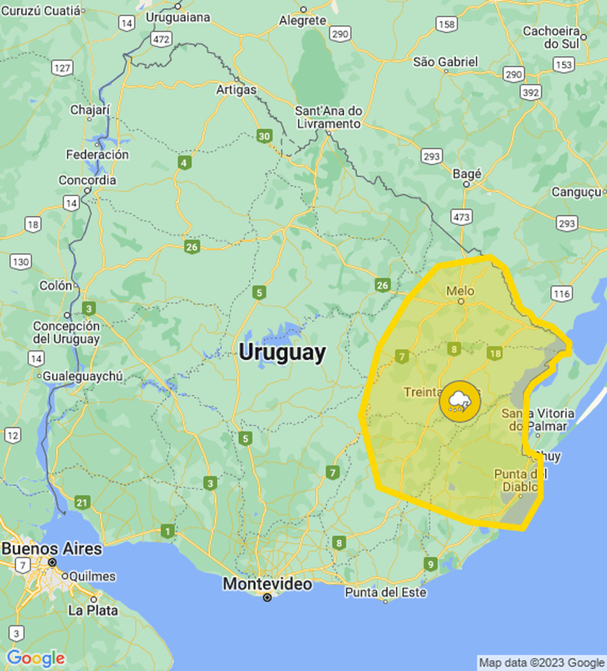 Meteorología actualizó la alerta amarilla por tormentas fuertes que rige para algunos departamentos sobre la región noreste del país. Ahora rige hasta las 19:30 horas.
