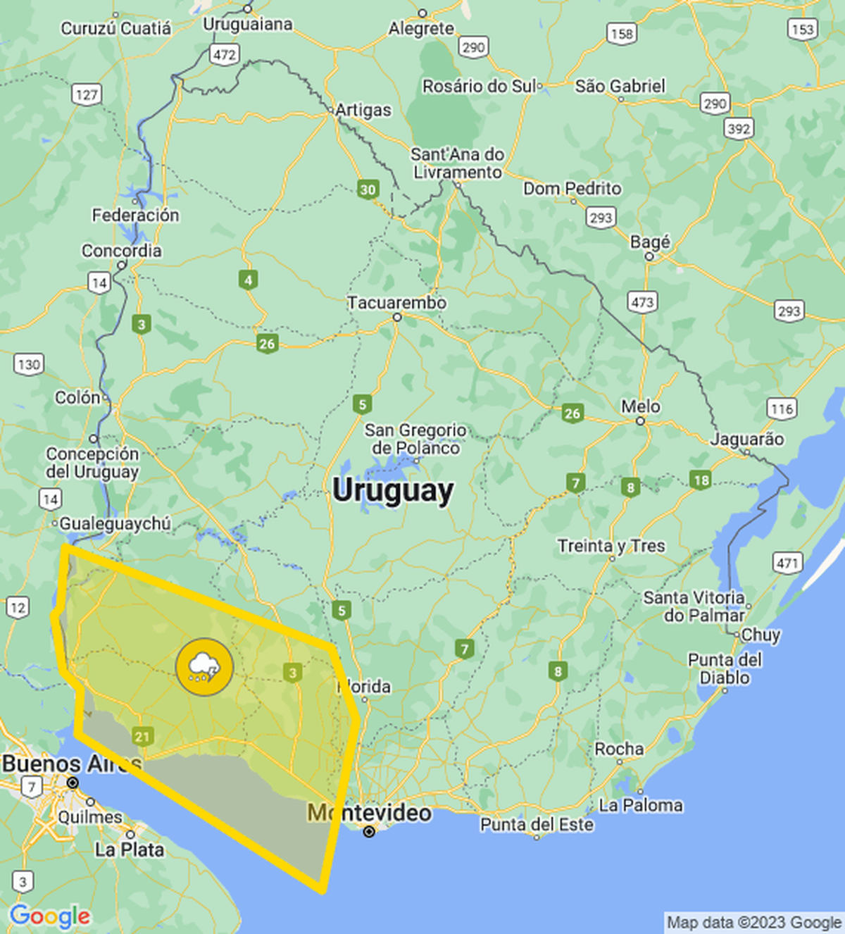 El Instituto Uruguayo de Meteorología actualizó una alerta amarilla por tormentas fuertes y lluvias intensas que rige para seis departamentos.