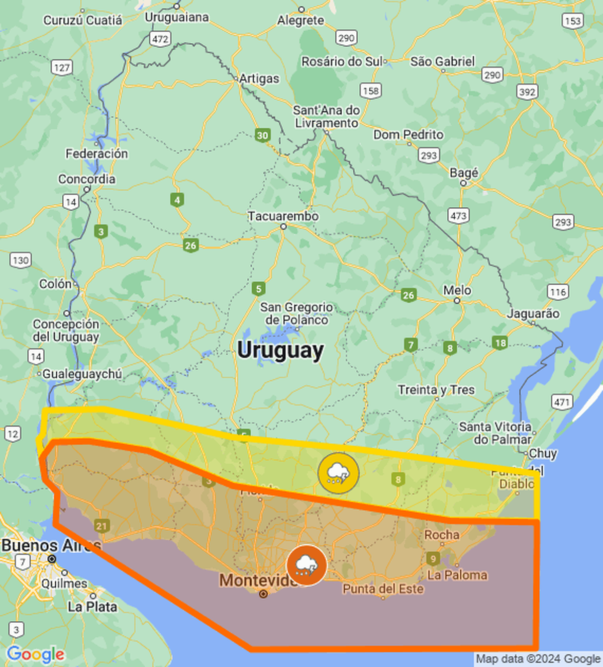 El Instituto Uruguayo de Meteorología ( Inumet) volvió a actualizar la doble alerta por tormentas fuertes y lluvias intensas, que ahora abarca a más localidades del este del país.