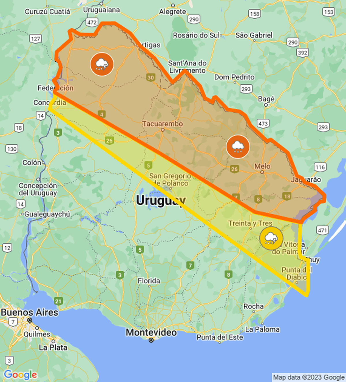 Meteorología actualizó la doble alerta por tormentas fuertes y lluvias intensas, que ahora rige para localidades del noreste del país.