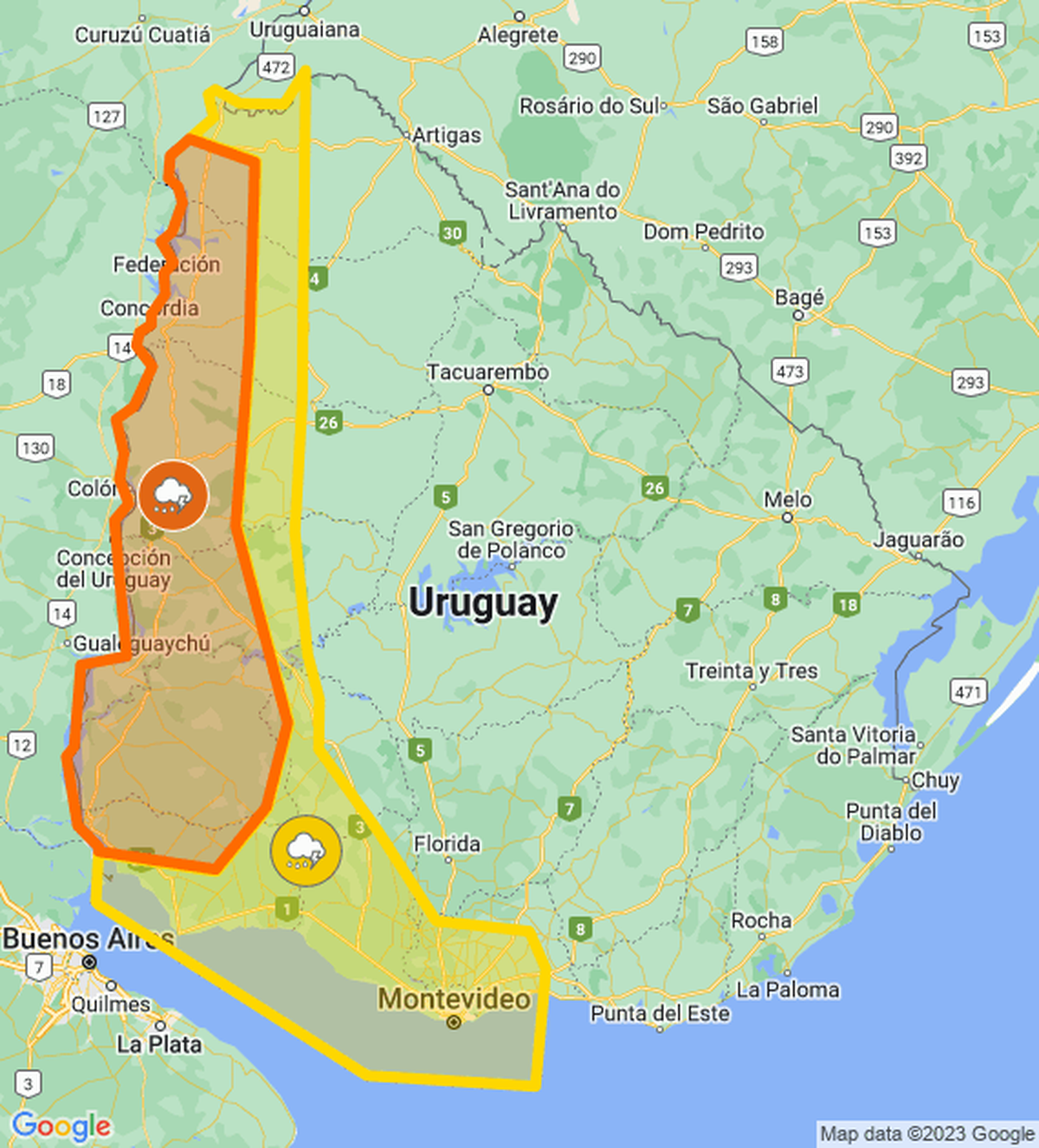 El Instituto Uruguayo de Meteorología actualizó doble alerta naranja y amarilla por tormentas fuertes y lluvias intensas. Rige hasta las 21:30.