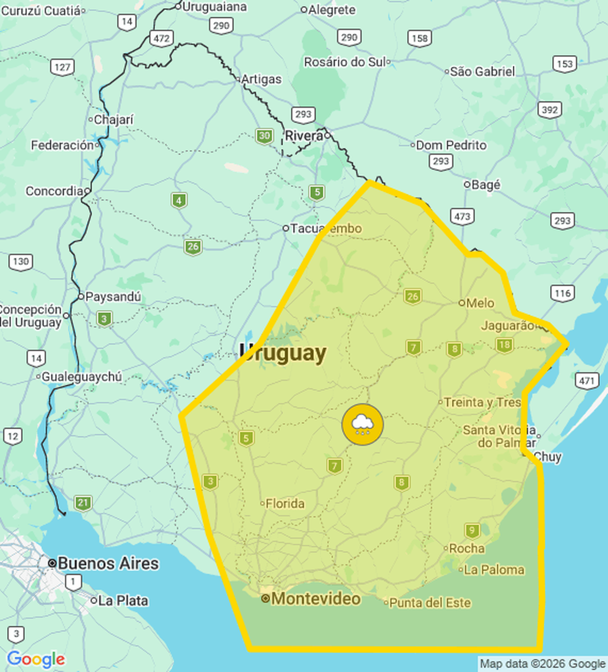 El Instituto Uruguayo de Meteorología actualizó a las 15:30 la advertencia amarilla por la persistencia de lluvias abundantes.