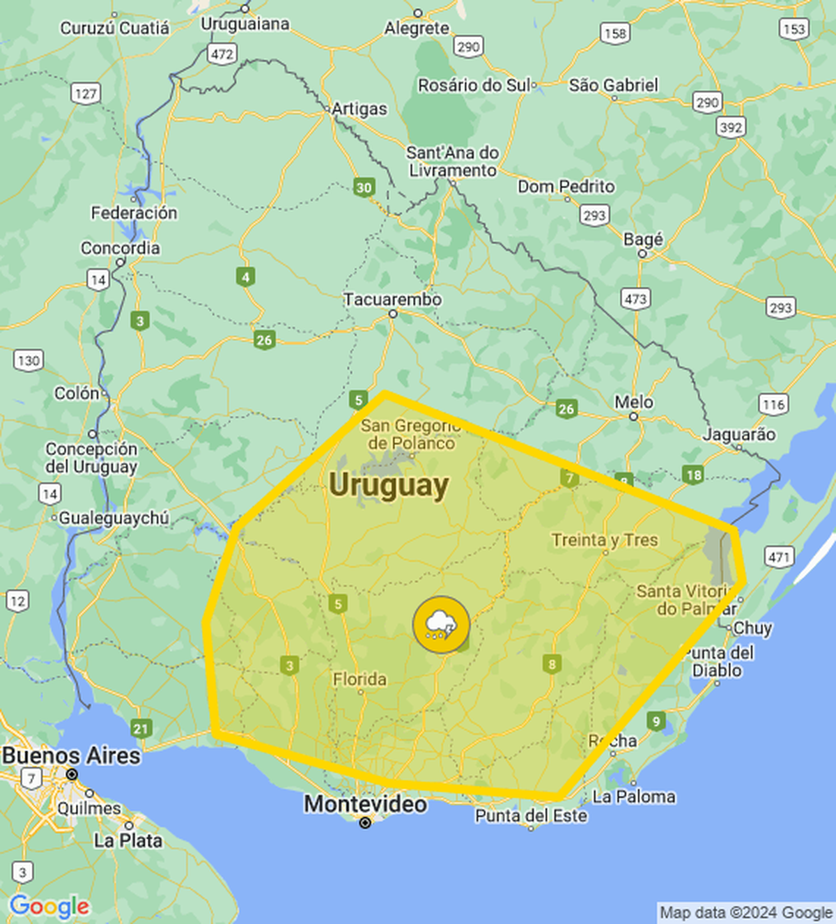 El Instituto Uruguayo de Meteorología actualizó la alerta amarilla por tormentas fuertes, por la que se puede registrar “lluvias intensas en cortos períodos, ocasional caída de granizo, intensa actividad eléctrica y rachas de viento fuertes”.