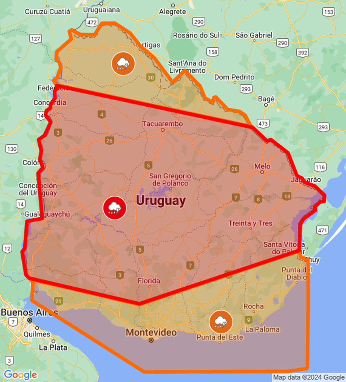 El Instituto Uruguayo de Meteorología actualizó la alerta roja que ahora rige para más departamentos, y la doble alerta naranja para el sur y el norte.