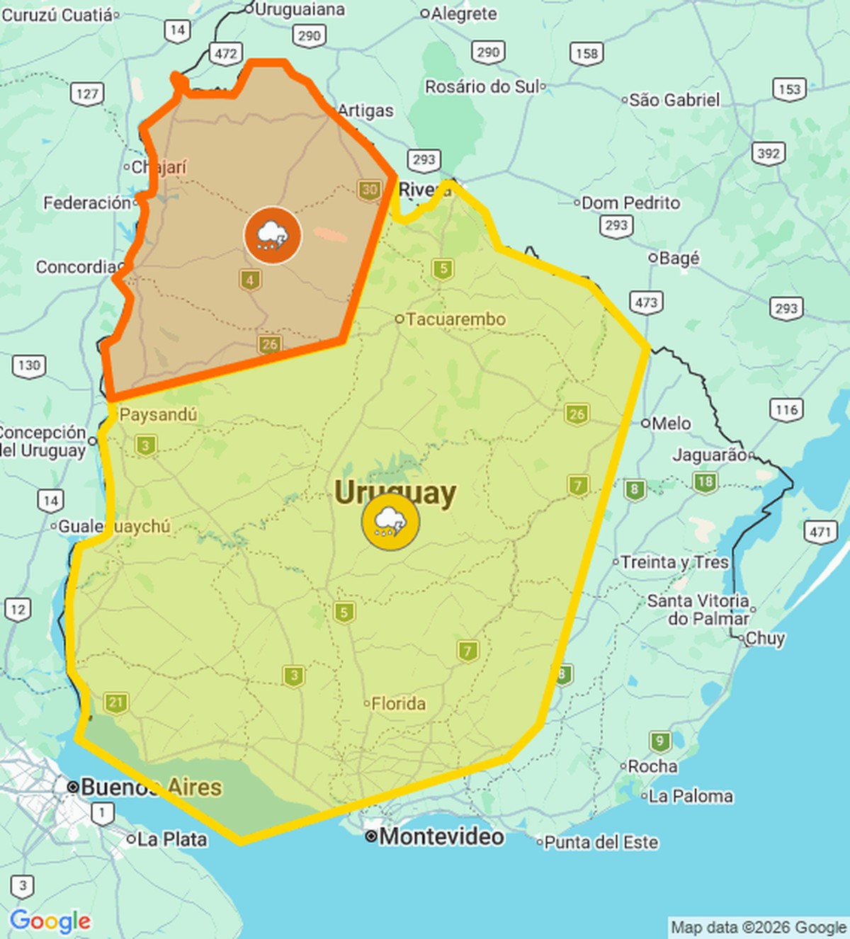 Meteorología extendió la advertencia amarilla, que rige para localidades de tres departamentos