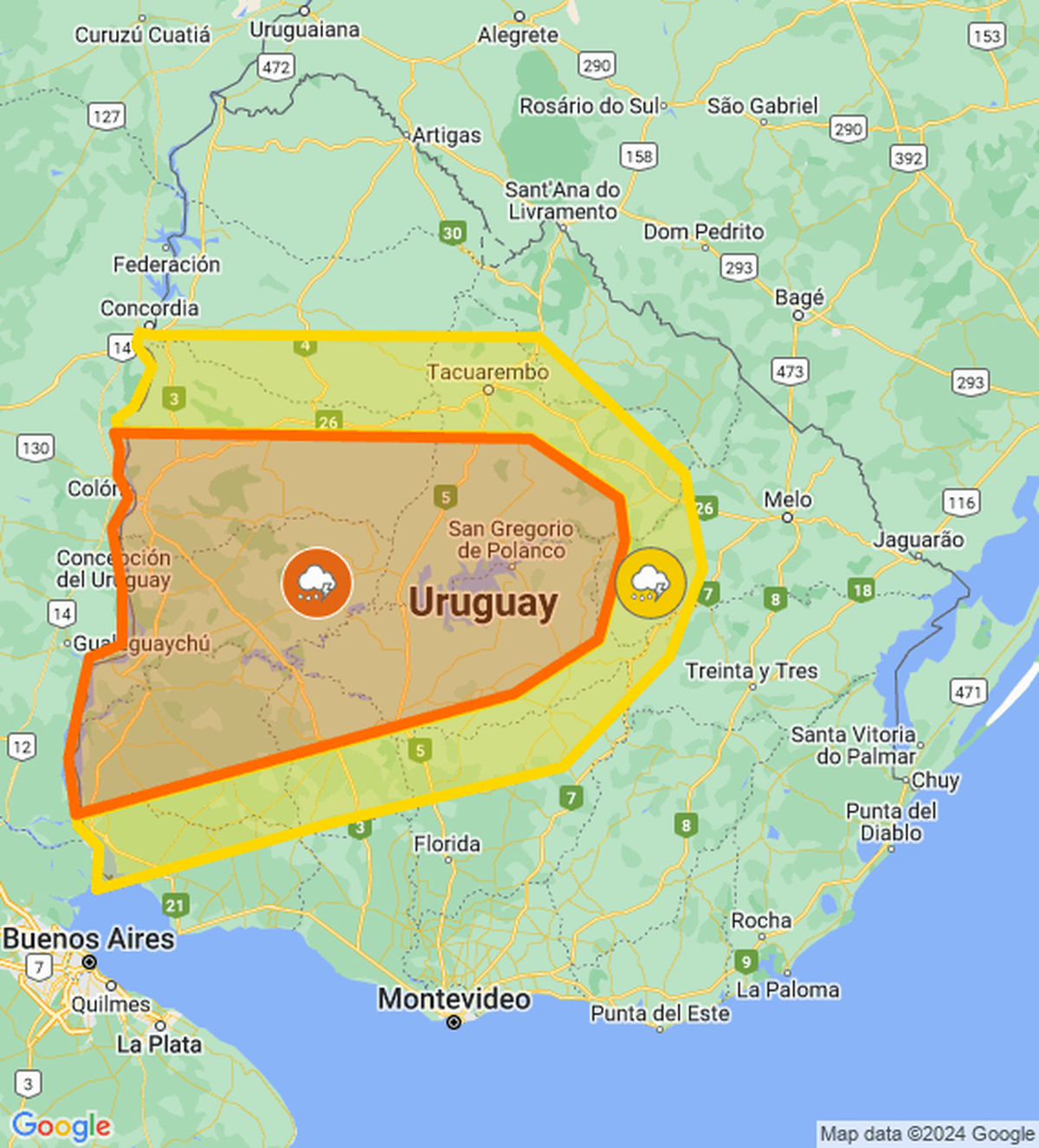 El Instituto Uruguayo de Meteorología actualizó la doble alerta por persistencia de tormentas y lluvias. Ahora rige hasta las 16:30 o hasta que el instituto informe cambios.
