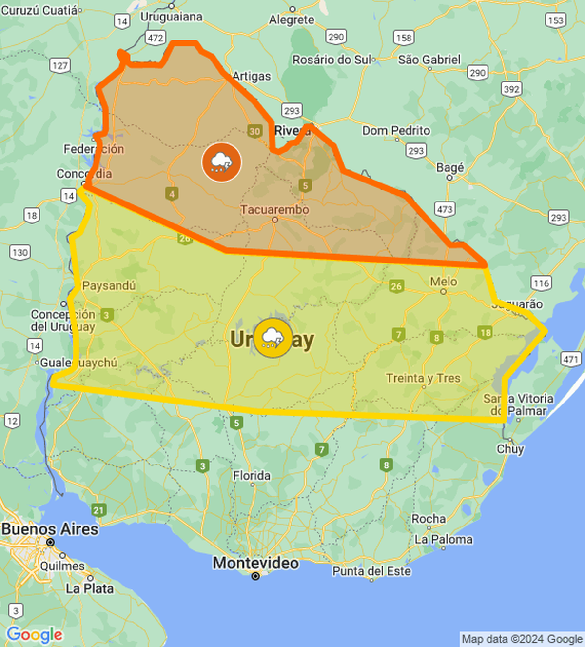 El Instituto Uruguayo de Meteorología (Inumet) actualizó la doble alerta, naranja y amarilla, por tormentas fuertes y lluvias intensas.