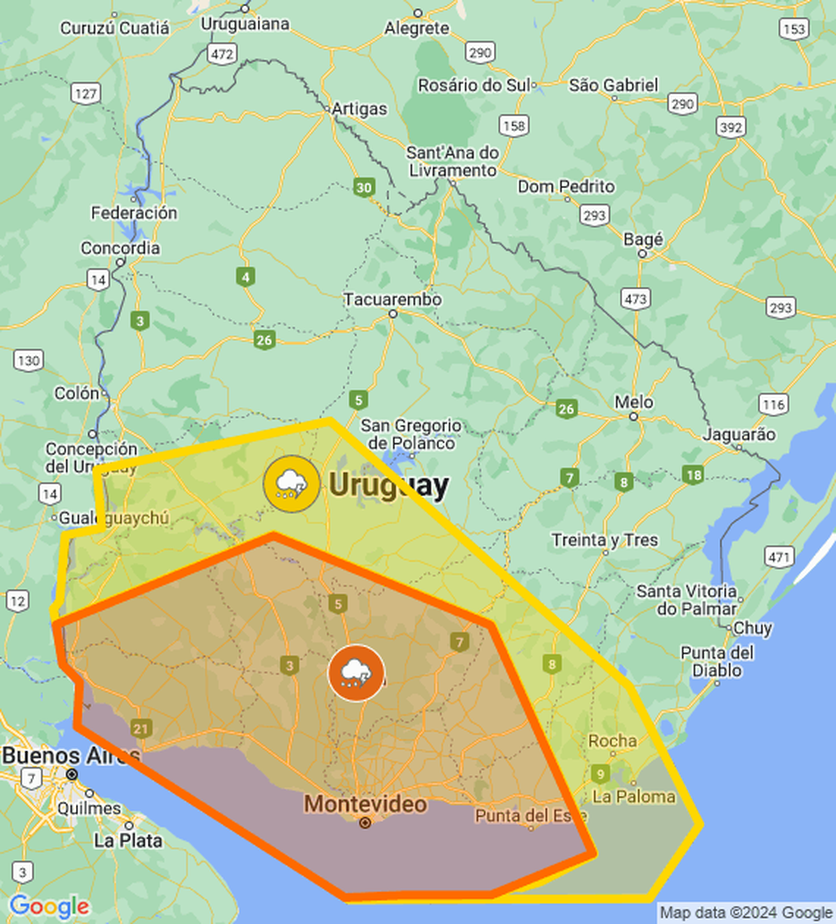 La doble alerta naranja y amarilla fue actualizada por el Instituto Uruguayo de Meteorología.