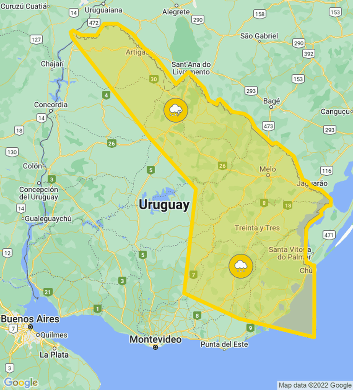 Meteorología extendió alerta amarilla por tormentas fuertes y lluvias intensas para varios departamentos del este y el norte del país.