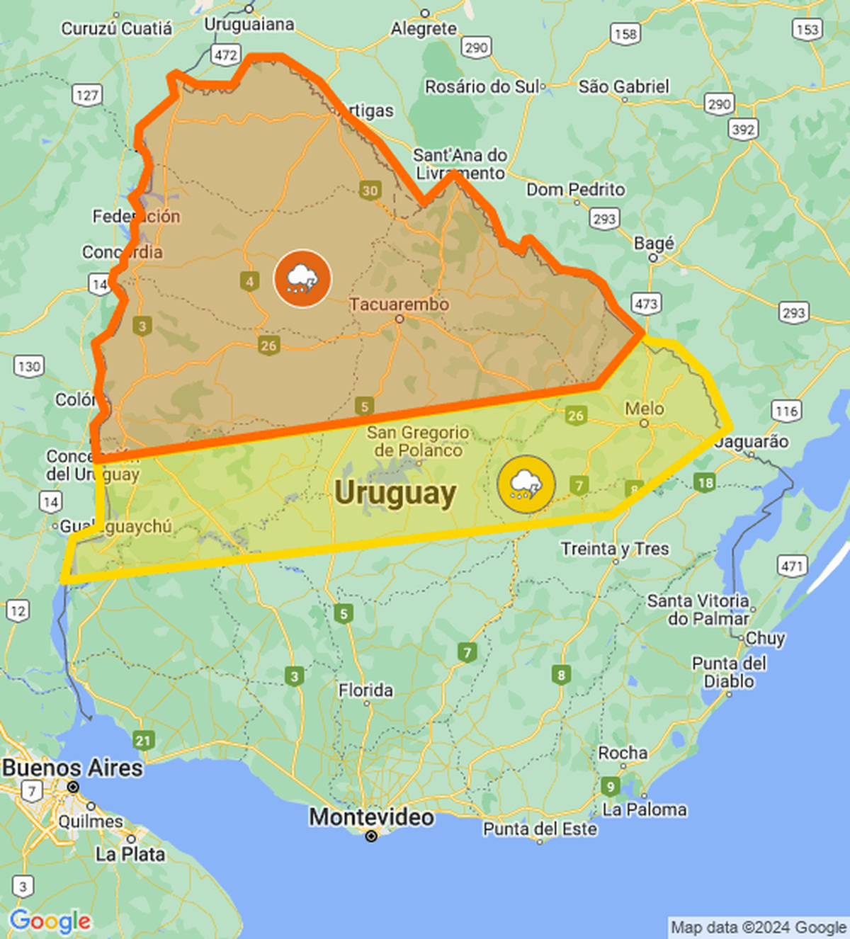 El Instituto Uruguayo de Meteorología extendió hasta las 15:00 horas y amplió el territorio para la doble alerta por tormentas fuertes y lluvias intensas.