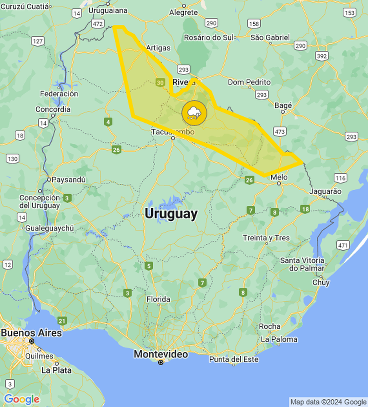 El Instituto Uruguayo de Meteorología (Inumet) emitió una alerta amarilla para cinco departamentos por tormentas fuertes y lluvias intensas. Está vigente hasta las 21:45.