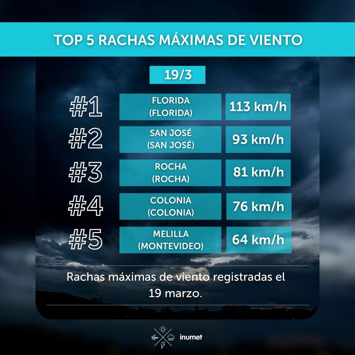 El martes 19 la racha máxima de viento fue a última hora del martes, en Florida, con 113 km/h.