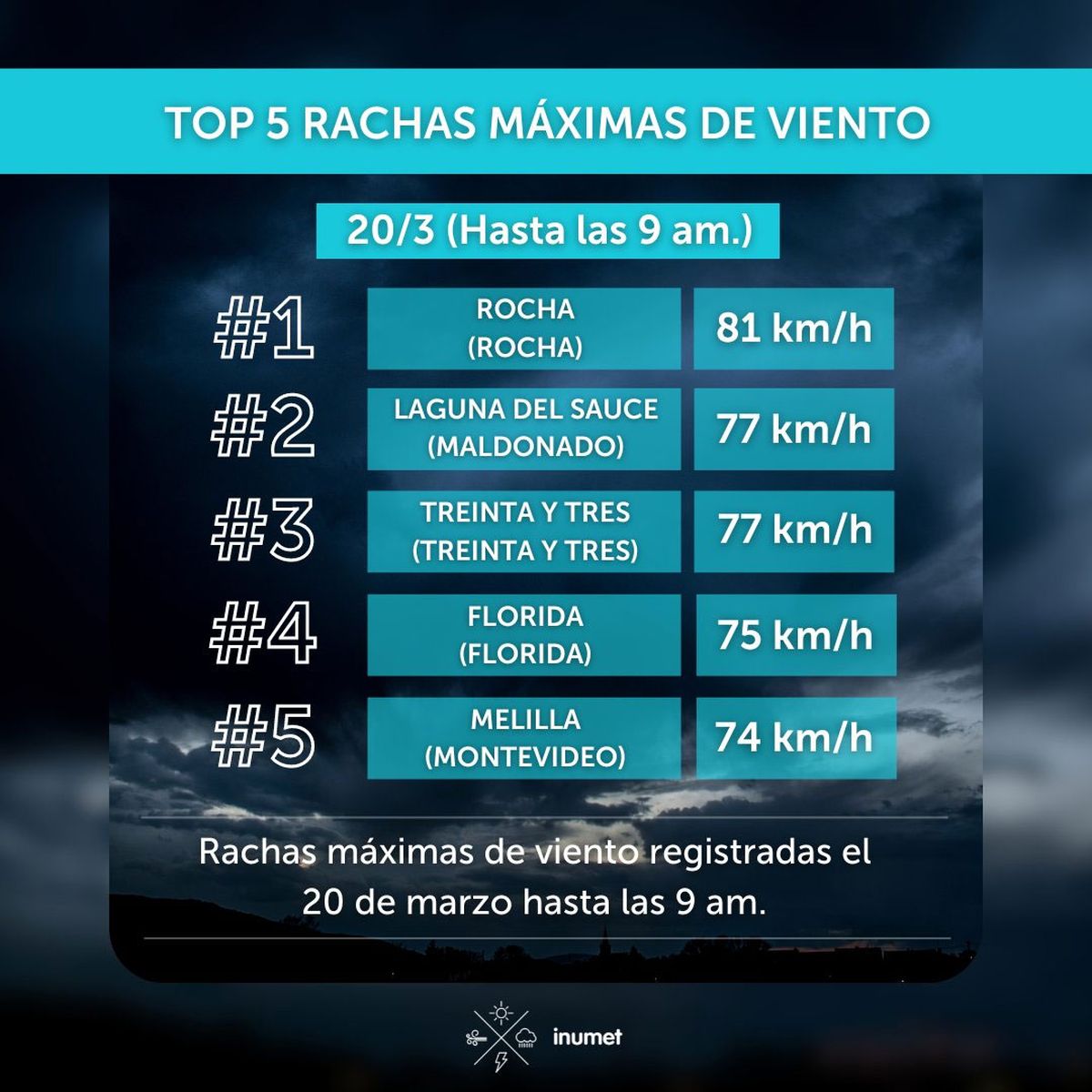 En tanto este miércoles, hasta la hora 9, en informe oficial indica que Rocha registró la racha máxima con 81 km/h.