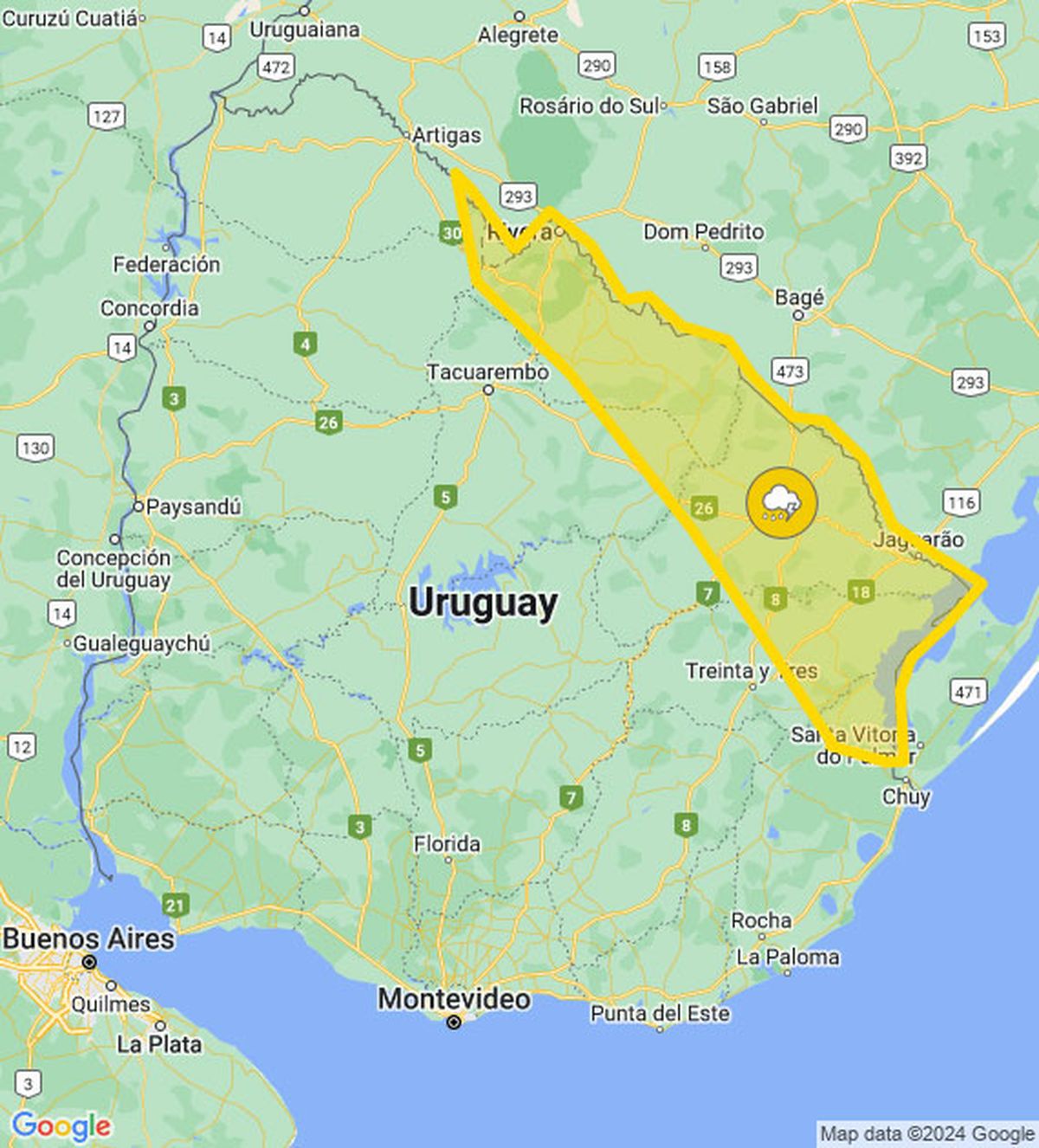 Meteorología mantiene este miércoles sobre el mediodía una alerta amarilla para el litoral noreste del país por persistencia de tormentas y lluvias, (mirá el mapa).