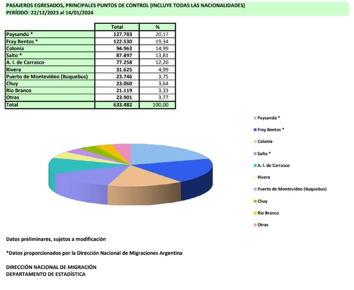 Entre el 22 de diciembre y el 14 de enero, salieron del país 633.482 personas e ingresaron 661.113, de acuerdo a datos preliminares de la Dirección Nacional de Migraciones difundidos este lunes,.