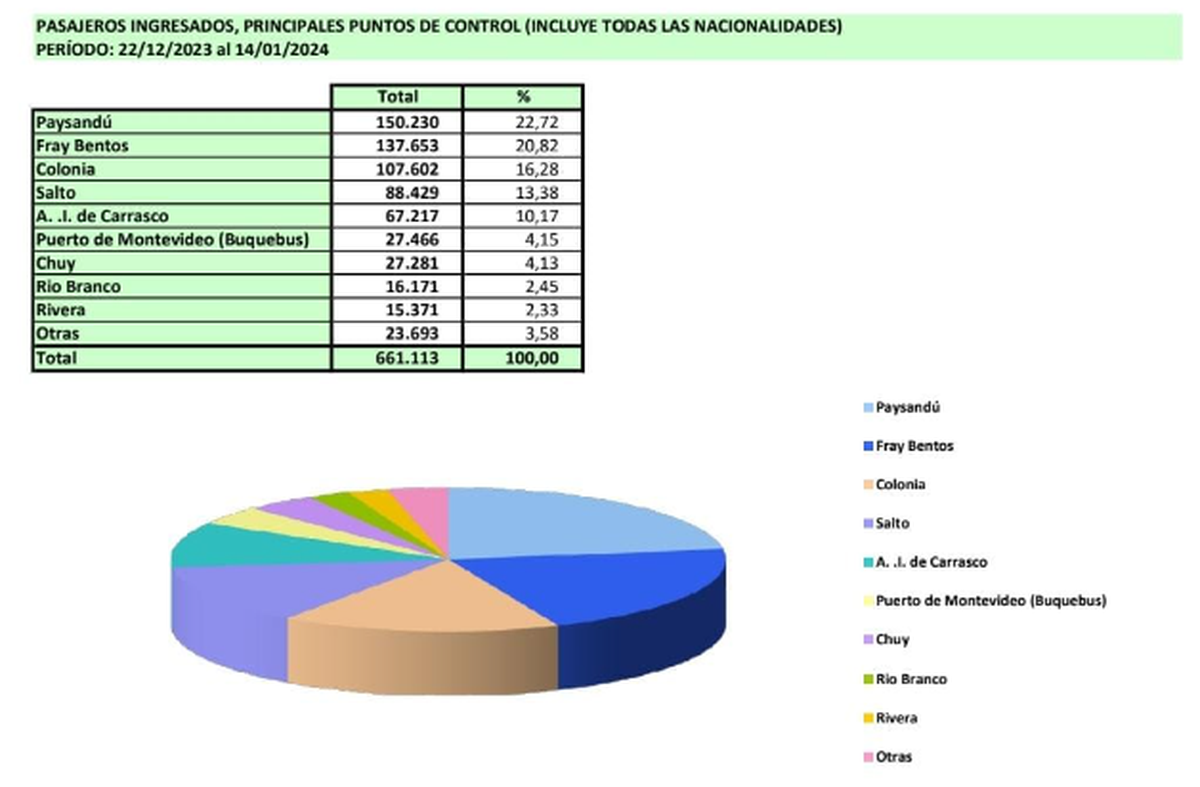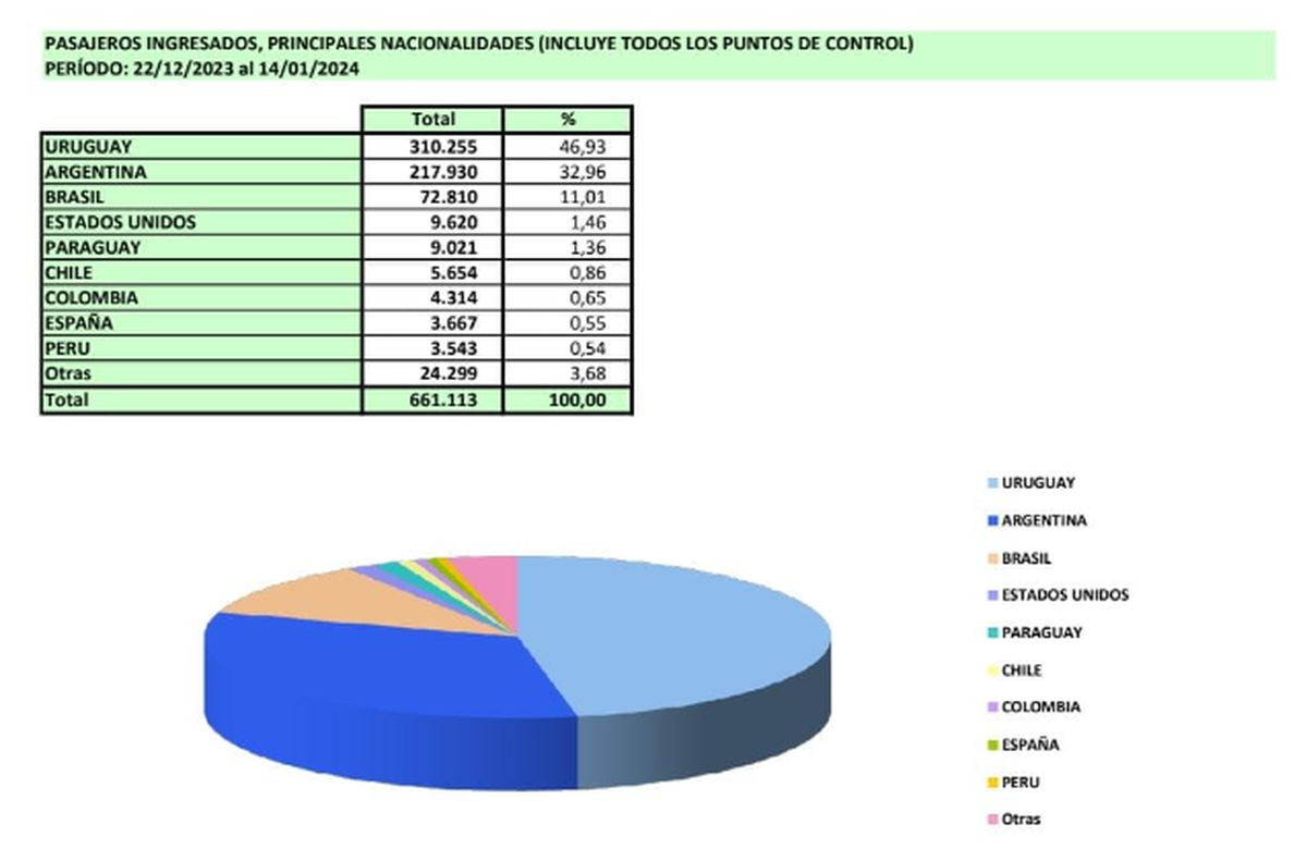 En tanto, las nacionalidades extranjeros que más ingresaron al país fueron argentinos (217.930) y brasileños (72.810). También entraron a Uruguay estadounidenses (9.620), paraguayos (9.021), chilenos (5.654), colombianos (4.314), españoles (3.667), peruanos (3.543) y otras que no especifica el documento pero suman 24.299.