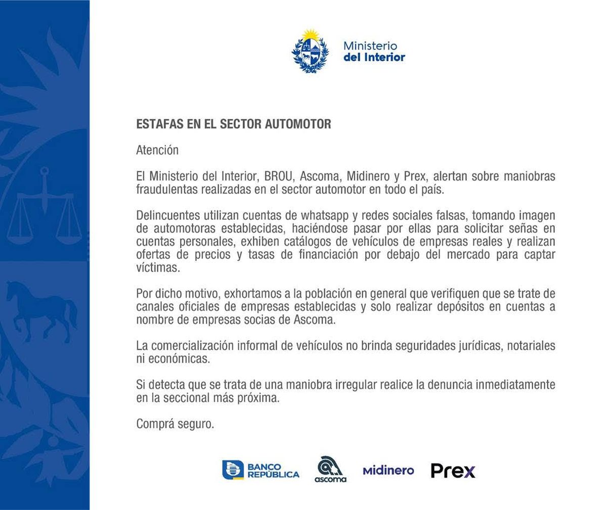 Ministerio del Interior, BROU, Ascoma, Midinero y Prex alertan por estafas en sector automotor en todo el país
