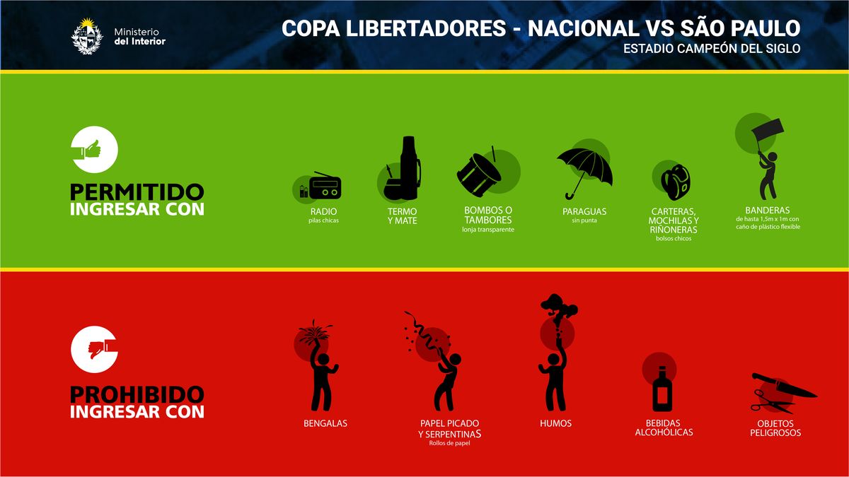 Estos son los objetos permitidos y prohibidos para el partido Nacional vs San Paulo.