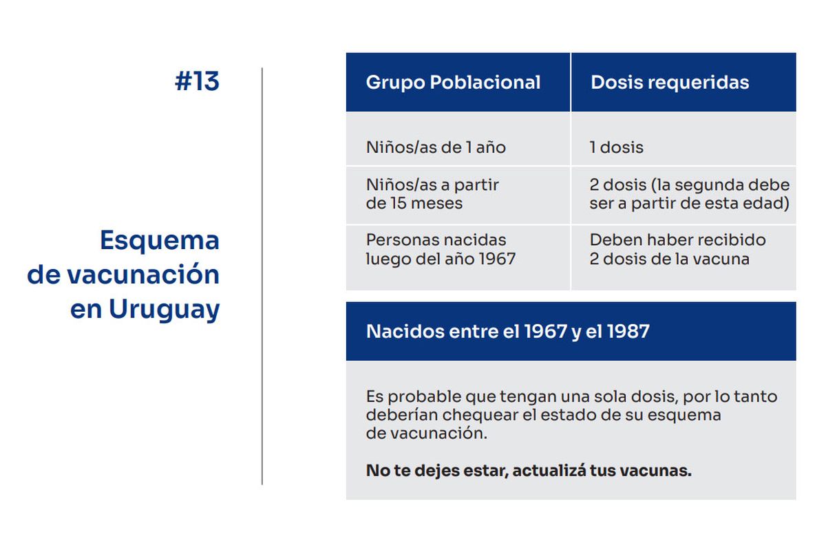 En Uruguay la vacuna contra el sarampión es obligatoria, gratuita y universal (para toda la población). Todas las personas deben tener dos dosis.