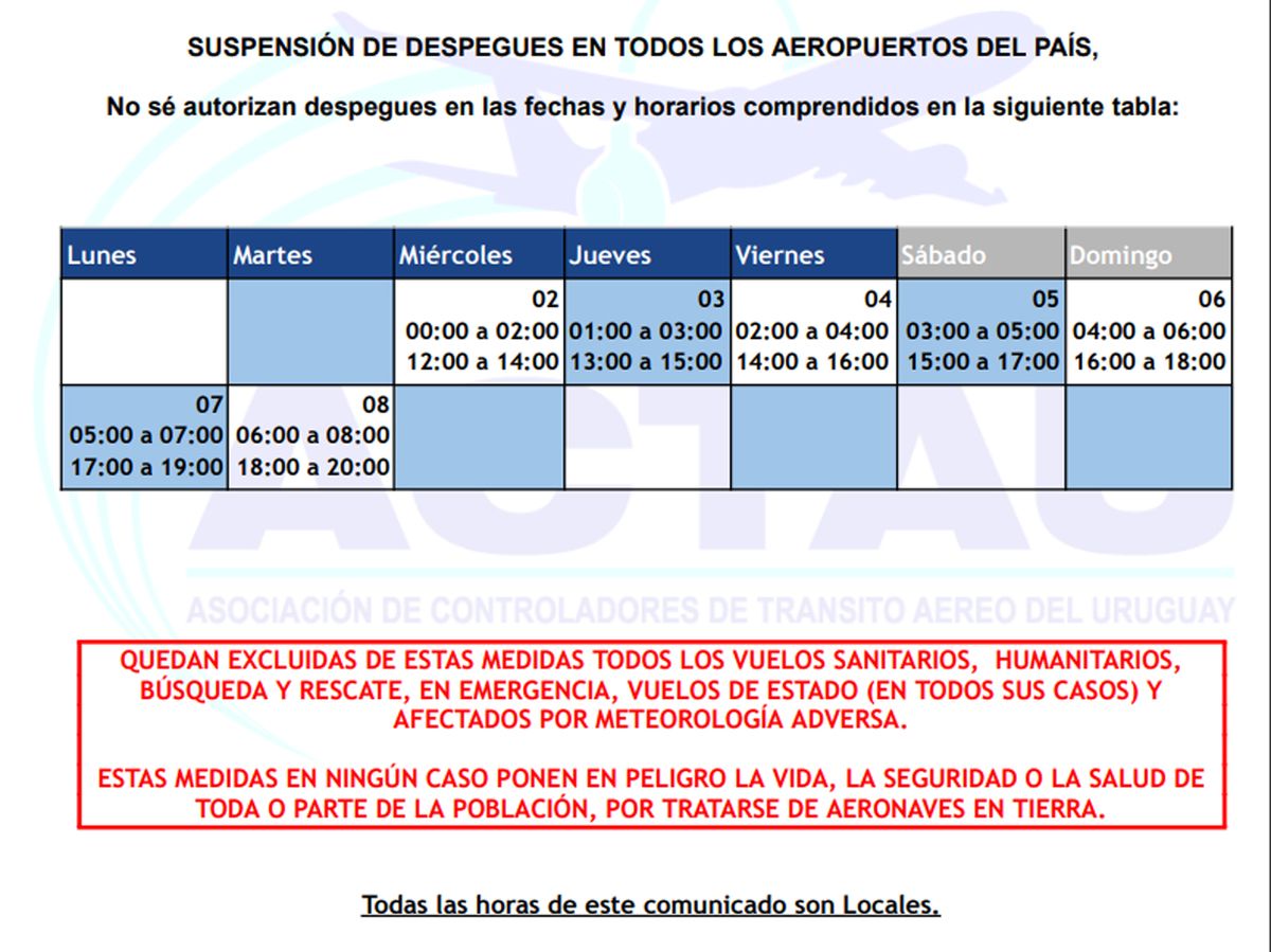El sindicato de controladores del tránsito aéreo fijó el siguiente cronograma de medidas que afectan el despegue de aeronaves en todos los aeropuertos del país, desde el miércoles 2 de agosto: