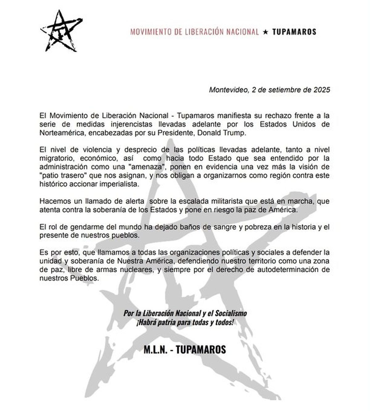 El Movimiento de Liberación Nacional- Tupamaros ( MLN-T) manifestó este martes su rechazo frente a lo que considera como "medidas injerencistas" del presidente de Estados Unidos, Donald Trump, en la región.