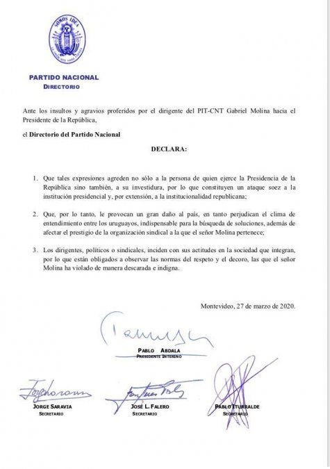 El Partido Nacional respondió al dirigente del PIT-CNT Gabriel Molina, quien insultó al presidente Luis Lacalle Pou en un audio de Whatsapp enviado a compañeros sindicalistas tras el anuncio del mandatario de un recorte salarial durante dos meses para funcionarios y jubilados públicos que ganan más de 80.000 pesos mensuales.