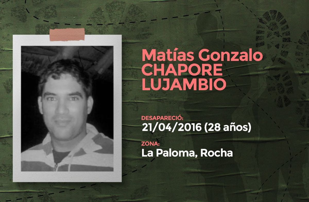 Matías Chapore tenía 28 años cuando desapareció el 21 de abril de 2016. Fue visto por última vez cuando tomó un ómnibus en La Paloma, Rocha, con destino a Colonia. "Se fue como se iba casi todos los meses a ver al hijo”, indicó a los pocos meses de su desaparición, su madre, Esther Lujambio, hoy fallecida. "Eran dos o tres días y volvía", indicó su madre.