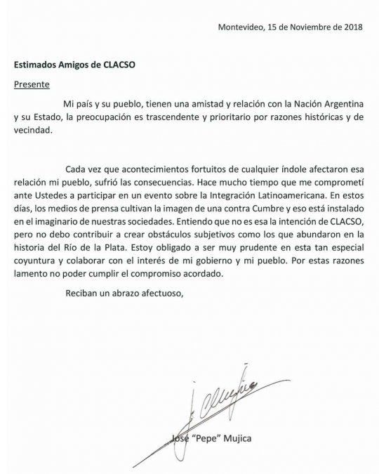 José Mujica había comprometido su presencia en el encuentro sobre el Pensamiento Crítico e Integración Latinoamericana organizado por el Consejo Latinoamericano de Ciencias Sociales (CLACSO) en Buenos Aires.