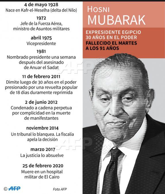 El expresidente egipcio Hosni Mubarak, obligado a renunciar tras un alzamiento popular en 2011, falleció este martes a los 91 años edad en el hospital militar Galaa de El Cairo, dijo a la AFP su cuñado, el general Munir Thabet.