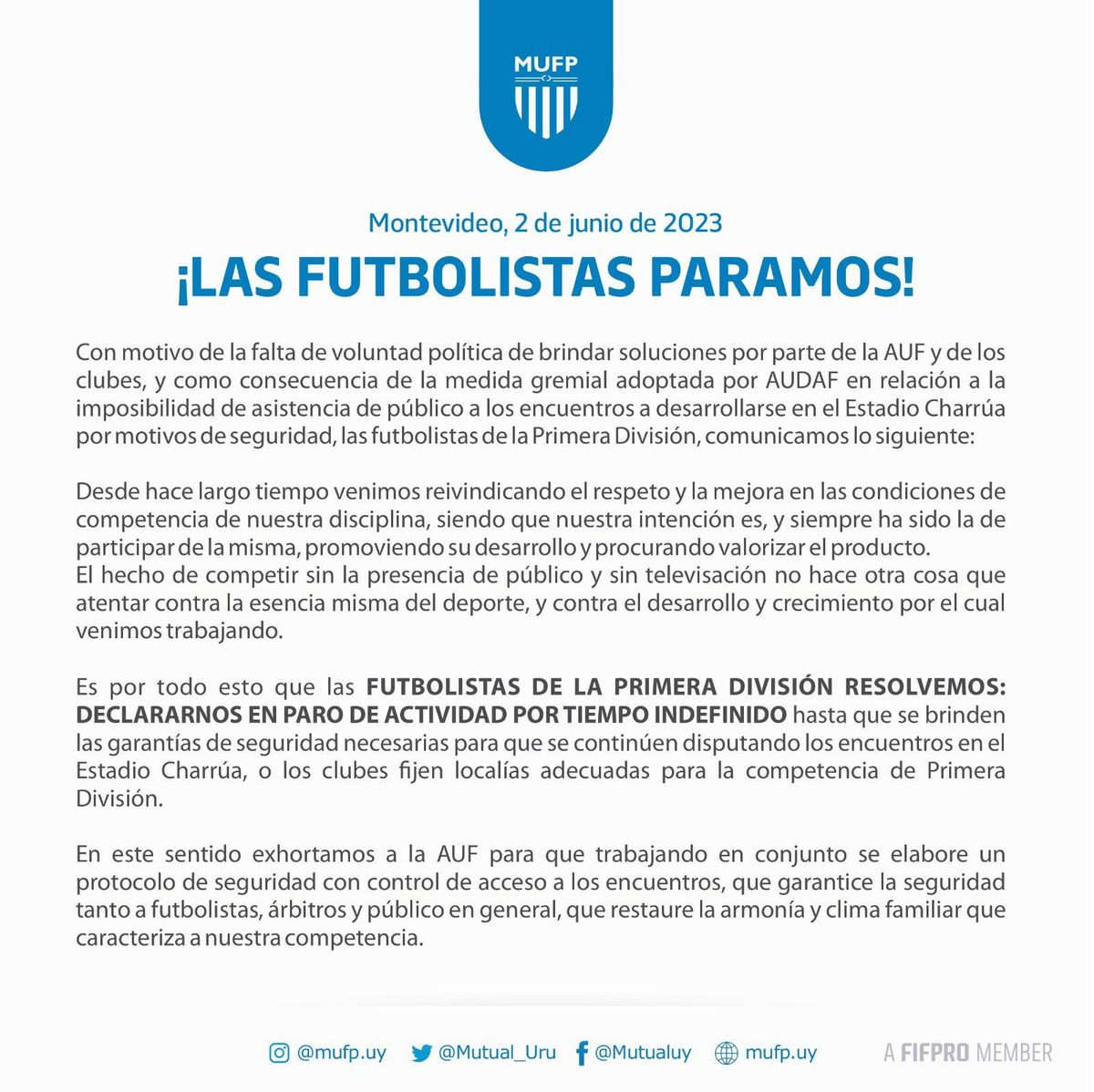 La Mutual Uruguaya de Futbolistas Profesionales(MUFP) resolvió un paro de actividad por tiempo indefinido de las futbolistas de la Primera División.