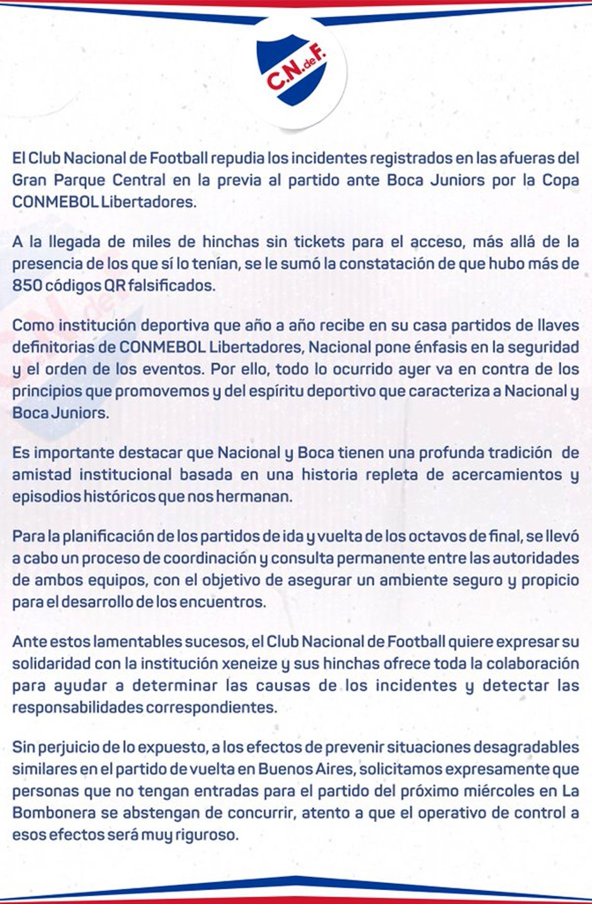 Nacional emitió un comunicado este jueves al mediodía por los incidentes ocurridos en la noche del miércoles, antes del partido con Boca por Copa Libertadores en el Gran Parque Central.
