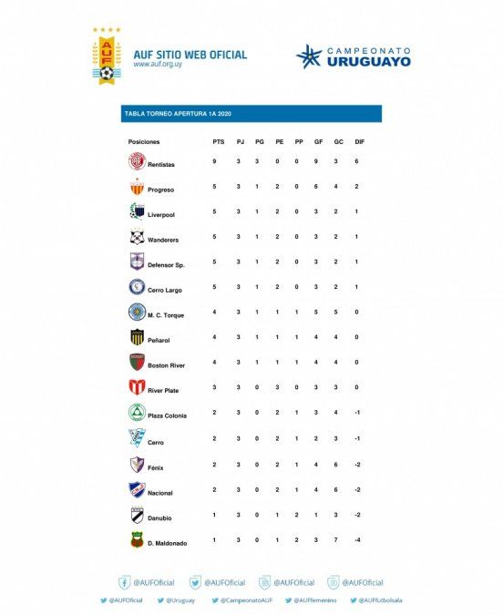Rentistas se afianzó como único líder del torneo, con puntaje perfecto, tras golear 4-1 a Deportivo Maldonado, con tantos de Alexis Rolín (4), Franco Pérez (77), Mauro Valiente (80) y Renato Cesar (85). El descuento fue de Mathías Tellechea (43).
