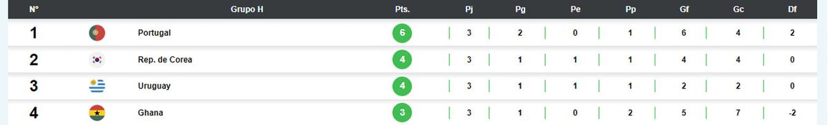 Uruguay venció 2-0 a Ghana pero Corea le ganó 2-1 a Portugal y clasificó porque tiene más goles a favor que la Celeste: 4 de Corea contra 2 de Uruguay.