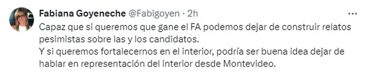 La directora de Relaciones Internacionales de la IMM, Fabiana Goyeneche, también se refirió al tema en la red social X. "Capaz que si queremos que gane el FA podemos dejar de construir relatos pesimistas sobre las y los candidatos. Y si queremos fortalecernos en el interior, podría ser buena idea dejar de hablar en representación del interior desde Montevideo", sostuvo la jerarca.