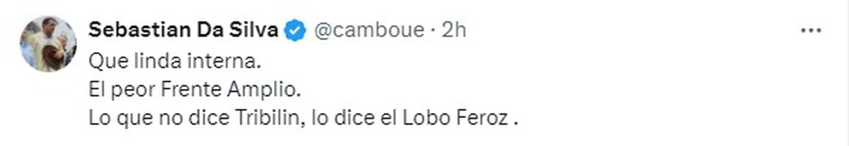 "Qué linda interna. El peor Frente Amplio. Lo que no dice Tribilín, lo dice el Lobo Feroz", escribió el senador Sebastián Da Silva.