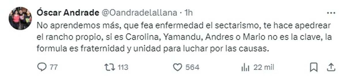 "No aprendemos más, que fea enfermedad el sectarismo, te hace apedrear el rancho propio, si es Carolina, Yamandú, Andrés o Mario no es la clave, la fórmula es fraternidad y unidad para luchar por las causas", afirmó el senador del Frente Amplio, Óscar Andrade, en la red social X.