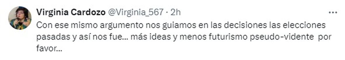 Desde la Intendencia de Montevideo, la directora de Salud de la comuna capitalina, Virginia Cardozo, escribió: "Con ese mismo argumento nos guiamos en las decisiones las elecciones pasadas y así nos fue… más ideas y menos futurismo pseudo-vidente por favor…".